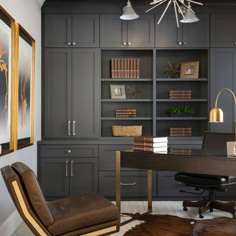 Рабочий кабинет не обходится без удобных мебельных изделий: кресла, компьютерного стола, на котором должно уместиться все необходимое и дополнительных шкафчиков.