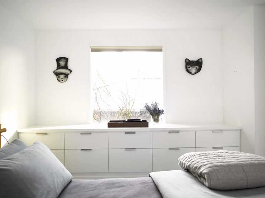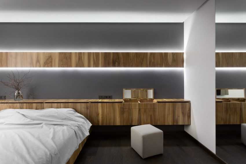 Фишка помещения ‒ тщательно разработанные системы хранения. Иногда помещение визуально зонируется: активные люди нередко работают перед сном, а прикроватная тумбочка с настольной лампой для них ‒ необходимый атрибут. В отделке стен используются традиционные для минимализма сочетания оттенков, лежащих в одной части спектра.