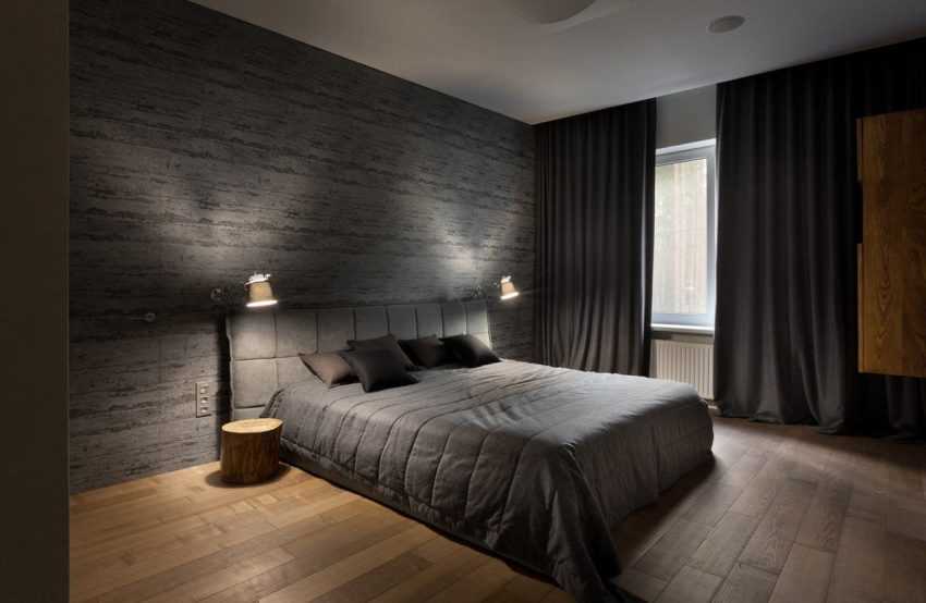 Современный мужской интерьер признает не только темные тона, но и насыщенные цвета, яркие акценты. Белая мужская спальня выглядит весьма оригинально и не менее брутально, чем комната в темных тонах. Светлый интерьер также вполне допустим, а грубая мебель из дерева и плотные шторы лишь дополнят мужскую спальню. Отделка стен под камень или кирпич наполнит интерьер мужских духом, подчеркнет изысканный вкус владельца помещения.