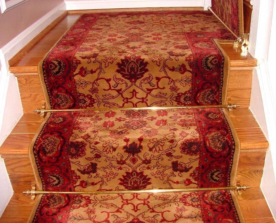 Самый доступный способ крепления ковролина к лестнице своими руками. Лучше всего подходит для ступенек широких лестниц. Лестница обшивается единым полотном, которое фиксируется по углам ступенек штангами. Затем штанги вставляются в специальные кольца.