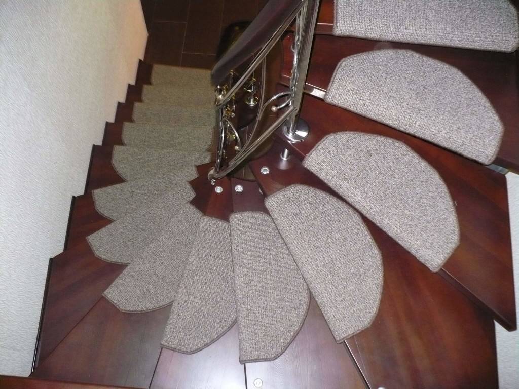 Когда производится отделка ступеней лестницы поворотной и винтовой конструкции, замеры производятся по внешнему краю. При том, что самая широкая ступенька, расположенная на повороте, определяет ширину требуемого напольного покрытия. Ковролин для винтовой лестницы вырезают для каждой ступени отдельно, поскольку размеры ступеней индивидуальны и не совпадают.