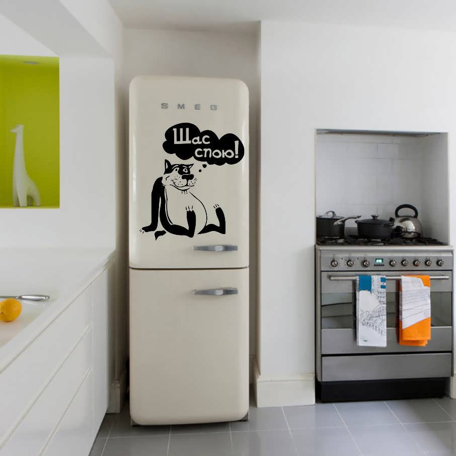 • На дверце холодильника стикер с изображением еды или симпатичного котика создаст позитивное настроение и разбавит однообразную цветовую гамму;