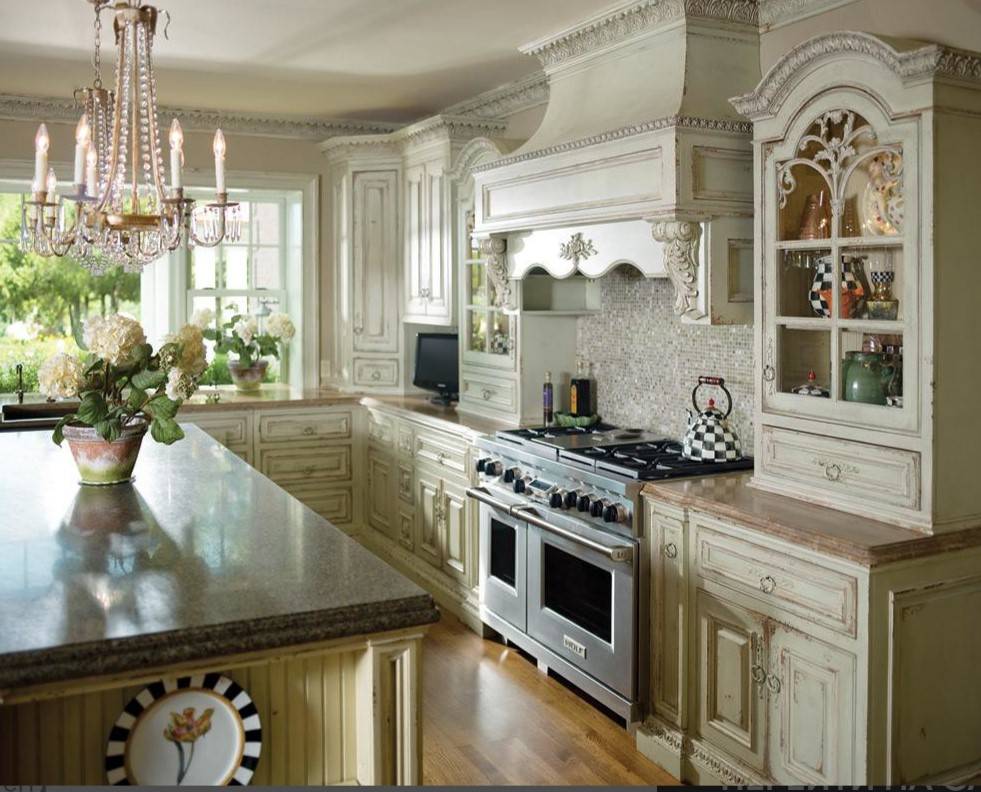 На кухне в прованском стиле можно оформить фартук с помощью маленькой мозаики