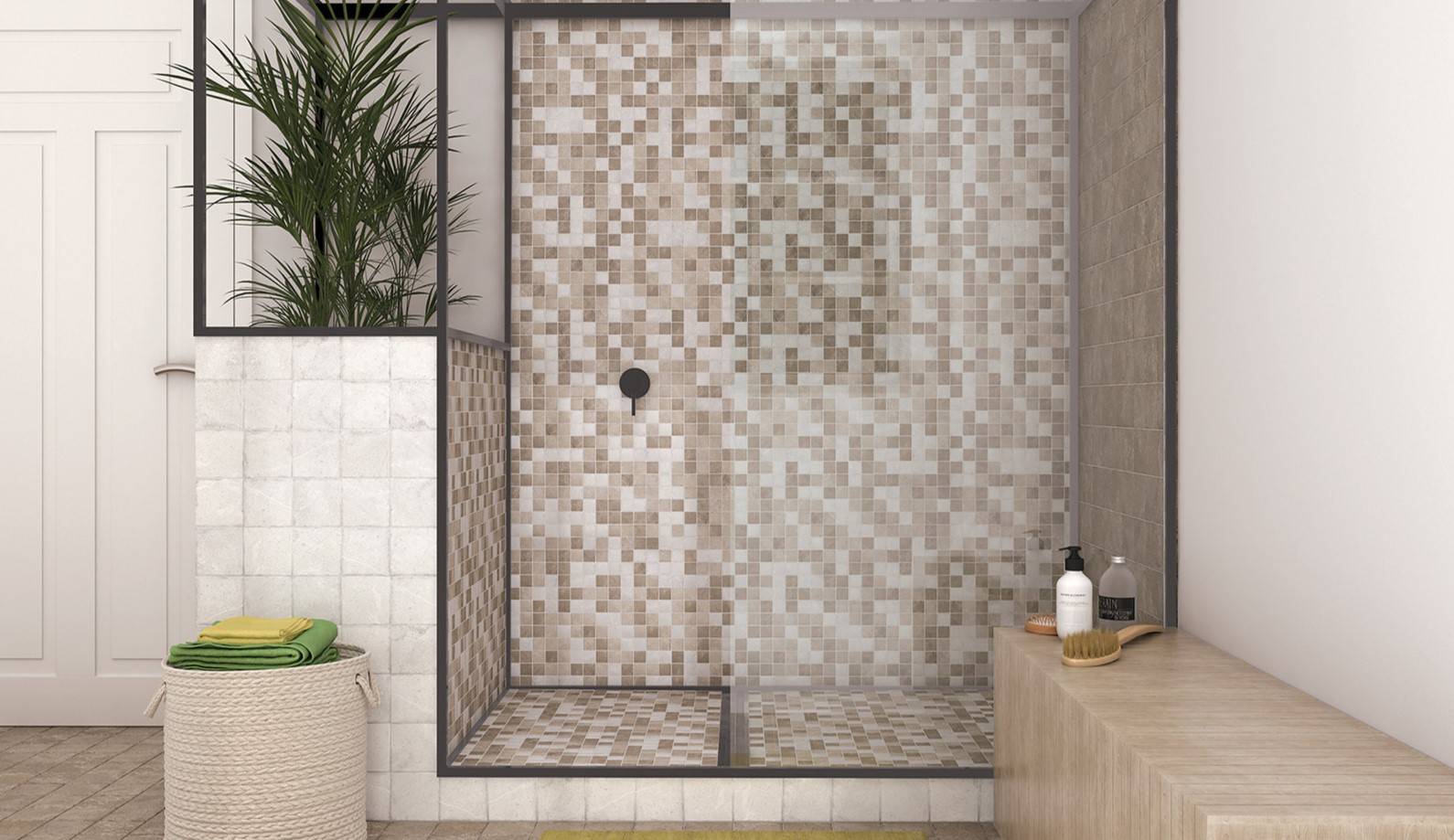 Мозаикой можно оформить душевую зону в ванной комнате