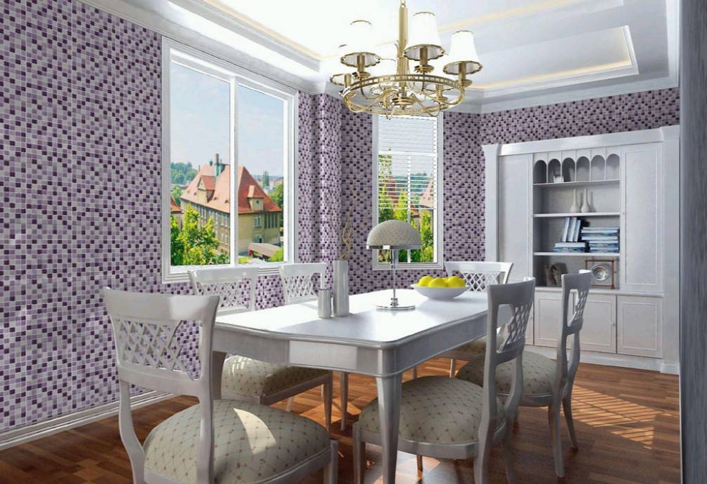 Оформление стен на кухне фиолетовой мозаикой