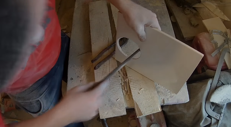 Шаг 8. Плоскогубцами постепенно отламывайте тонкие кусочки плитки по периметру отверстия. Доведите их до более-менее приемлемого состояния.