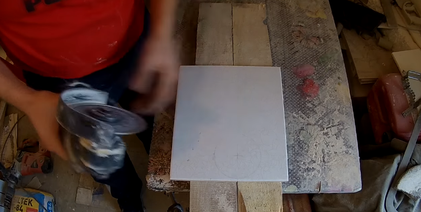 Шаг 3. Установите плитку на ровную поверхность, вырезаемое отверстие должно «провисать», чтобы диск не резал стол. Для этого можно взять две строганные доски и раздвинуть немного шире диаметра отверстия, а посредине положить плитку.