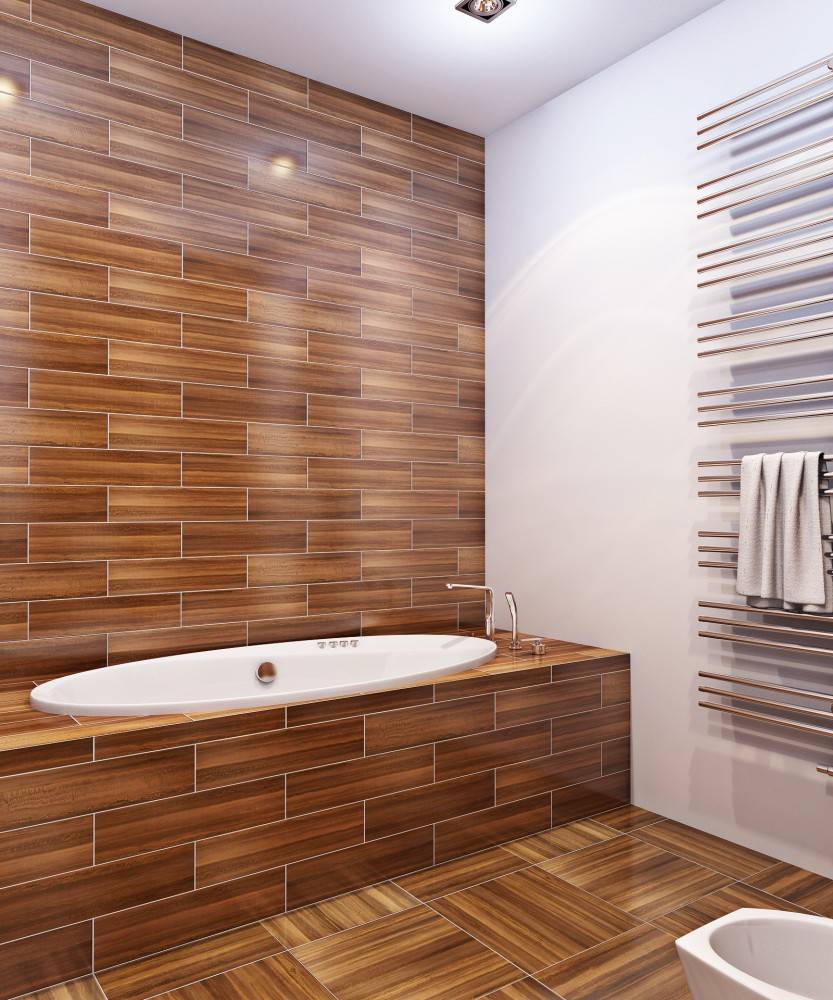 Керамическая плитка под дерево — это прочный, водонепроницаемый, долговечный и легкий в уходе материал, который подходит для оформления любых помещений, где способен создать натуральный интерьер. Материал используется преимущественно для укладки пола. Однако существует множество дизайнерских решений, которые предусматривают укладку керамической плитки под дерево на стену. Особенно это актуально для помещений с повышенной влажностью, например ванных комнат, стилизованных под сауну или баню.