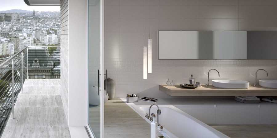 - В оформлении для маленькой ванной следует применять облицовку в светлых тонах, например, ясень, клен или беленый дуб с практически незаметным рельефом. Таким образом получится добавить помещению визуального простора.