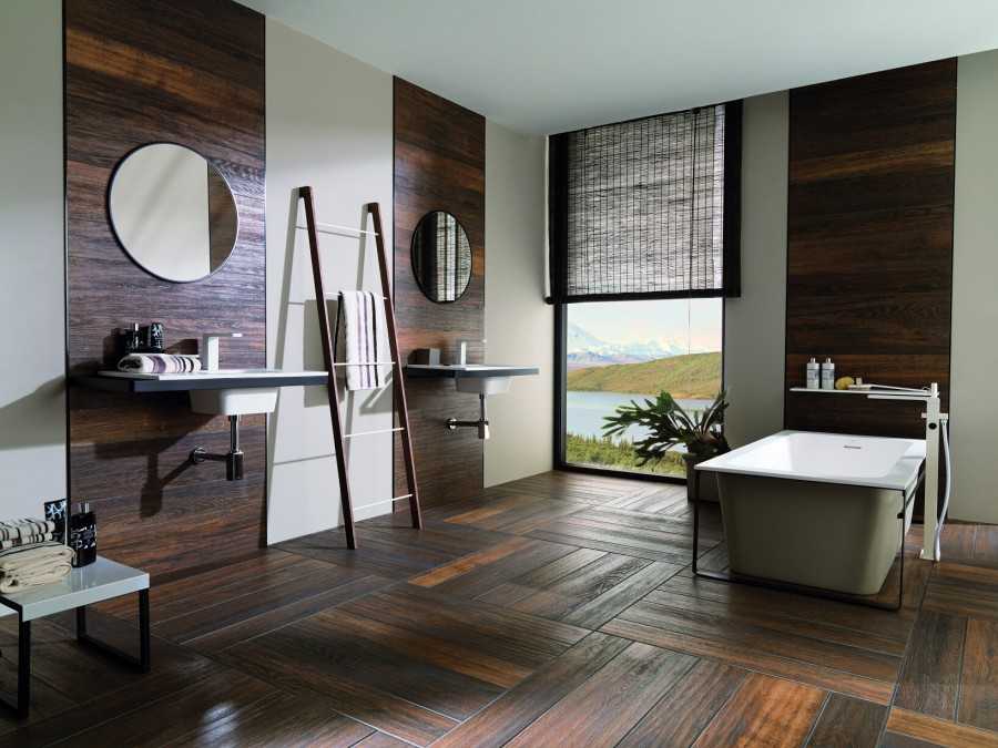 - В небольших помещениях лучше всего использовать светлую плитку — с текстурой сосны, березы, светлого ореха или ясеня. Это расширяет пространство. Если же Вы непременно хотите сделать пол темным, то позаботьтесь о том, чтобы светлыми остались стены, мебель и аксессуары. Иначе говоря, пусть темный пол будет акцентом, а не подавляющим элементом. Подробнее: Керамическая плитка для ванной — обзор.