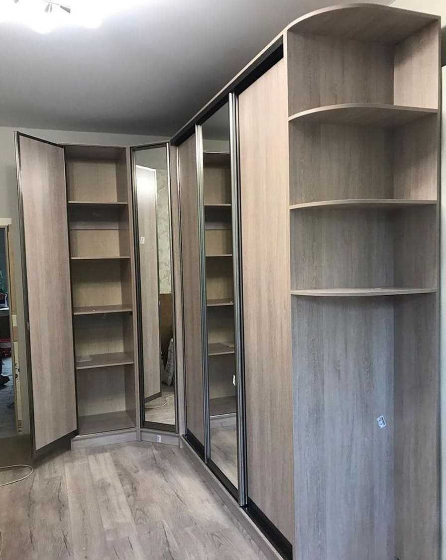 Эксперименты с функциональностью и компактностью угловых шкафов привели к созданию радиусных моделей. Главная особенность таких предметов мебели – закругленные фасады, которые подразделяются на 3 типа: