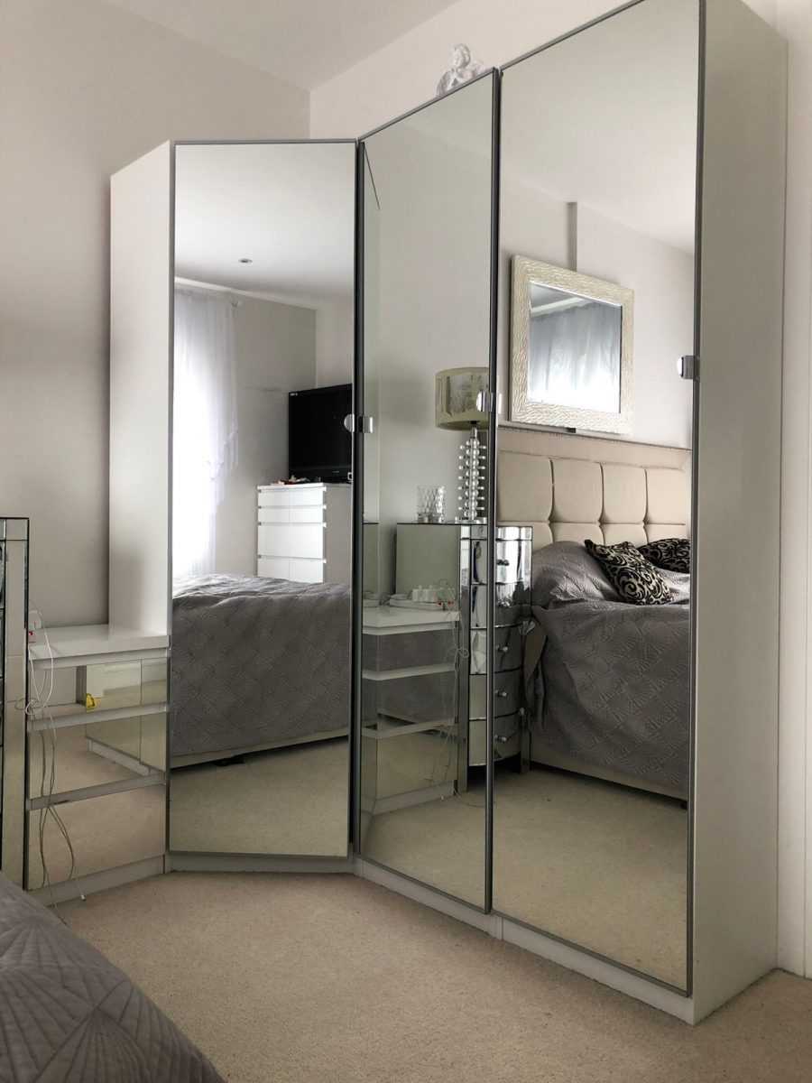 Довольно интересно выглядит угловой шкаф с зеркальными фасадами или вставками. За счет этого помещение визуально выглядит больше и светлее.