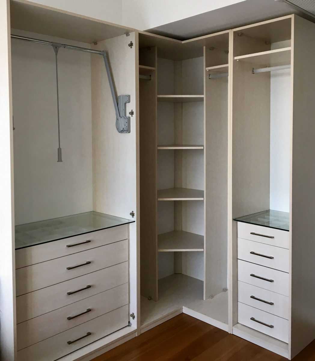 Возможности наполнения Г-образных моделей аналогичны простым шкафам-купе с сильным отличием – это присутствие в углу одной половины труднодоступной зоны. Чаще всего там оборудуют перекладину и хранят верхнюю одежду в межсезонье.