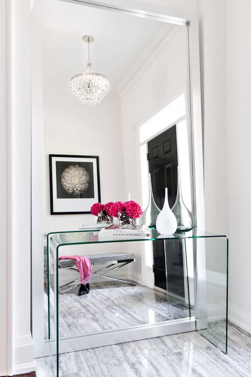 Правильно размещенные в прихожей зеркала обязательно визуально увеличат помещение. Зеркальные потолки со встроенным освещением станут истинным украшением любого интерьера. Зеркальные полы выполнять ту же функцию, что и зеркальные потолки, но они больше подойдут для выставочного зала, нежели для жилого помещения. Их недостаток заключается в быстрой загрязненности (вам придется старательно и тщательно мыть полы после каждого посещения гостей) и в царапании поверхности, которую будет очень видно.