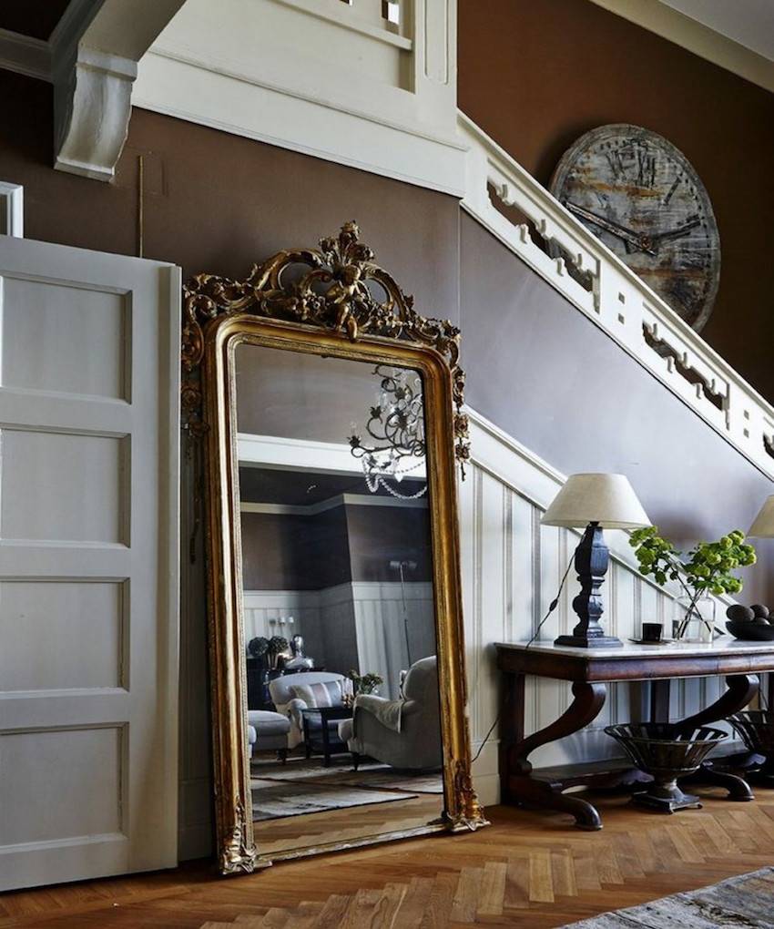 Такие зеркала всегда имеют раму и стойку, которая позволяет изменить их наклон. Обычно их размещают в просторных прихожих.