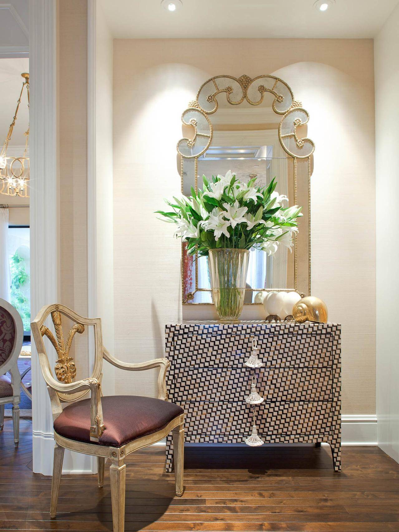 Данное размещение считается очень хорошей дизайнерской идеей. Желательно чтобы отражающее полотно было немного уже, чем комод, это позволит создать более органичную предметную комбинацию и значительно улучшить оформление зала.