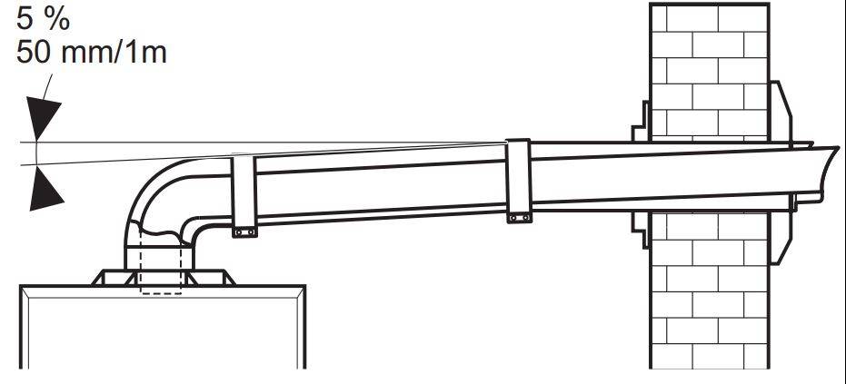 Главная особенность системы дымохода конденсационных котлов заключается в необходимости уклона в 5% между отводом и коленом подключения. Само же колено имеет изгиб не на 90 градусов, а на 87.