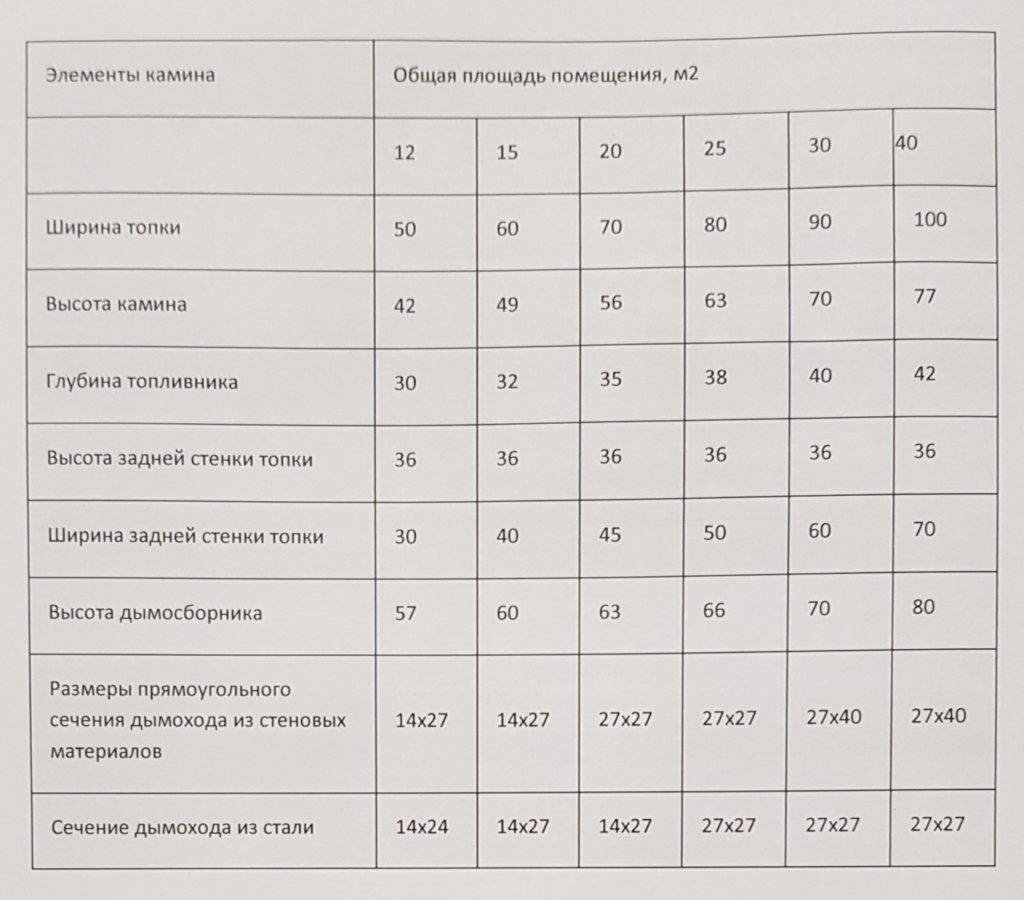 При расчете размеров, формы и материалов для постройки опытные мастера пользуются специальными формулами расчета. А для тех, кто самостоятельно пытается сделать расчет параметров рекомендуется использовать стандартные показатели размеров камина, приведенные в таблице.