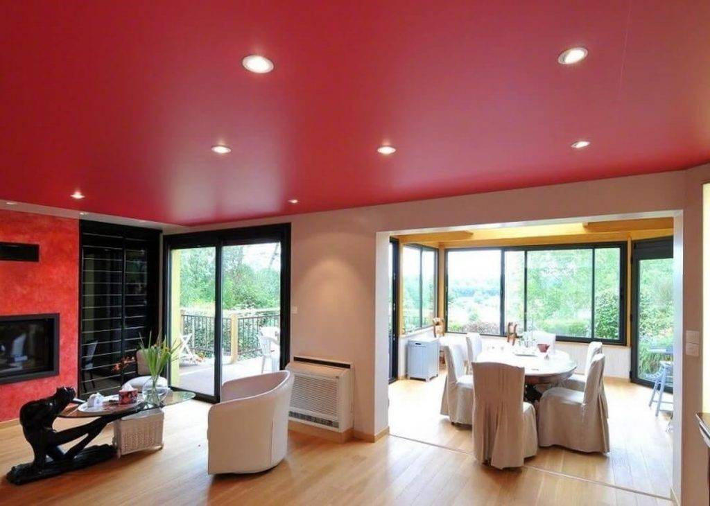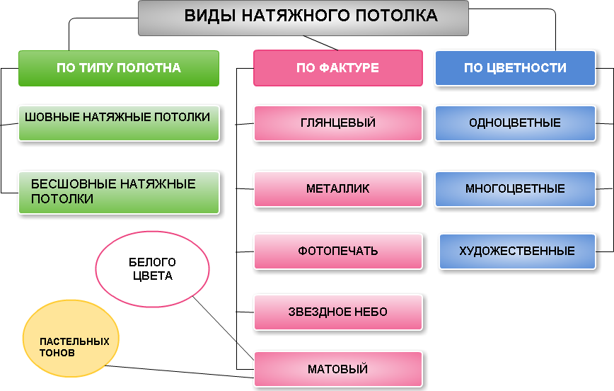 - Цветные. Рассматривая виды натяжных потолков на фото, можно отметить эстетичность и вариабельность покрытий. Добавляются оттеночные пигменты только природного происхождения.