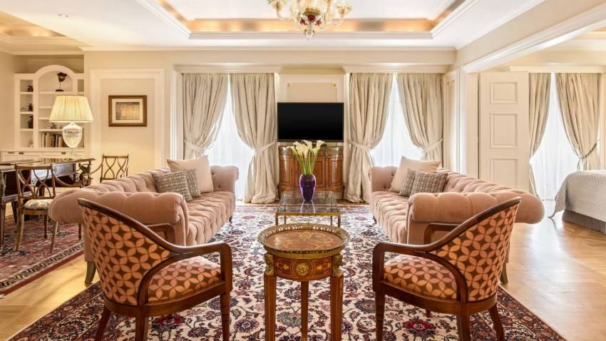 Мебель может быть совершенно любой, главное, чтобы она не занимала большую часть комнаты, это напрямую касается тяжелых, массивных классических диванов и кресел.