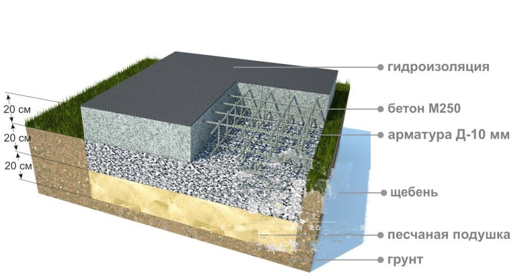 - При этом под ней должно быть две дренажных подушки (песчаная и щебёночная), каждая из которых имеет такую же толщину. Сама плита может практически не заглубляться. Армируют её пространственным каркасом, связанным из стальных стержней диаметром 10 мм. При изготовлении бетона в него добавляют противоморозные и водоотталкивающие присадки, а затем поверхность готового фундамента обрабатывают пропиточным составом.