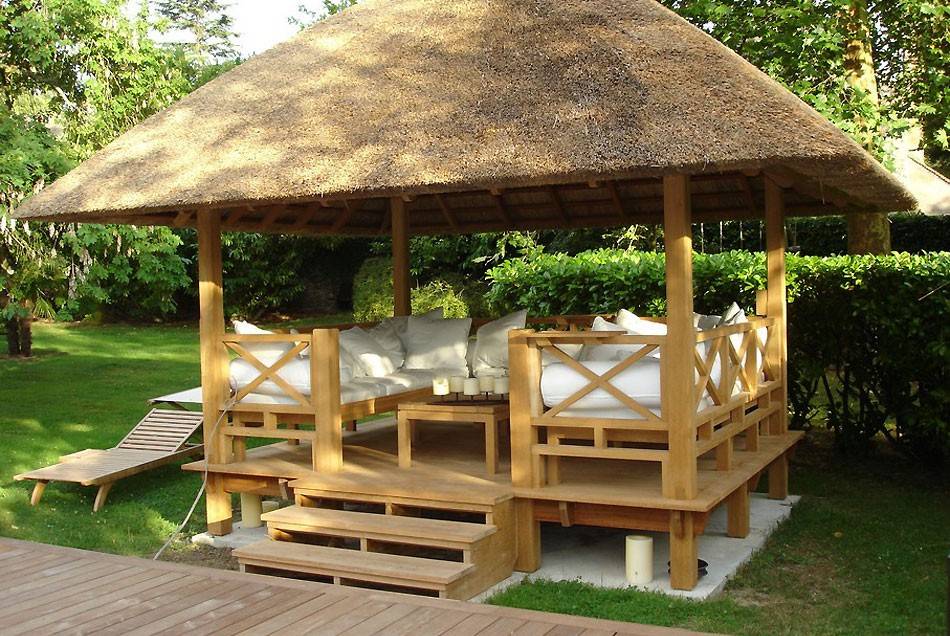 Обратите внимание и на необычный облик данной беседки, оригинальность которому придаёт соломенная крыша. Чем не идея для загородного дома или дачи?
