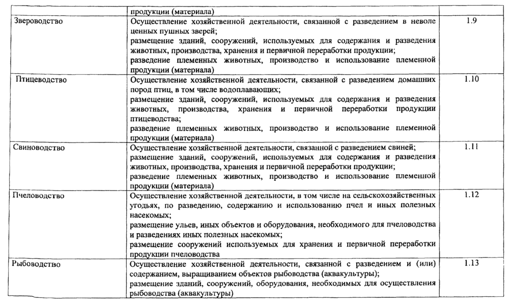 На примере того же пункта 1 можно увидеть, что участок, на котором разрешены сельскохозяйственные работы, также может использоваться под строительство зданий для хранения и переработки получаемой продукции. Столбец с кодами содержит только числовые обозначения, соответствующие тому или иному типу разрешения на эксплуатацию.