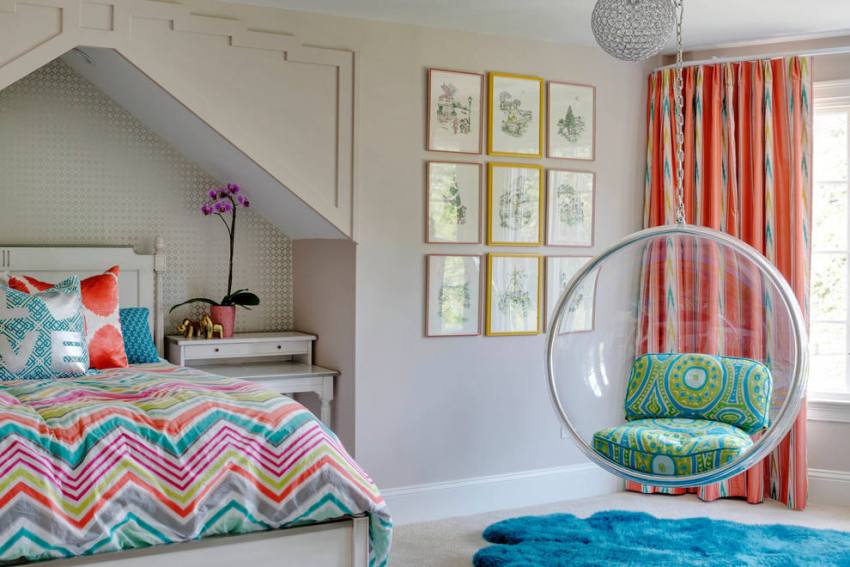 Кроме того, для комнаты девочки, особенно старше 11 лет, могут использоваться овалы, горошки, узоры в виде ромбов, полосок и клетки. С помощью таких принтов можно визуально изменять границы пространства, что актуально для слишком маленьких детских.