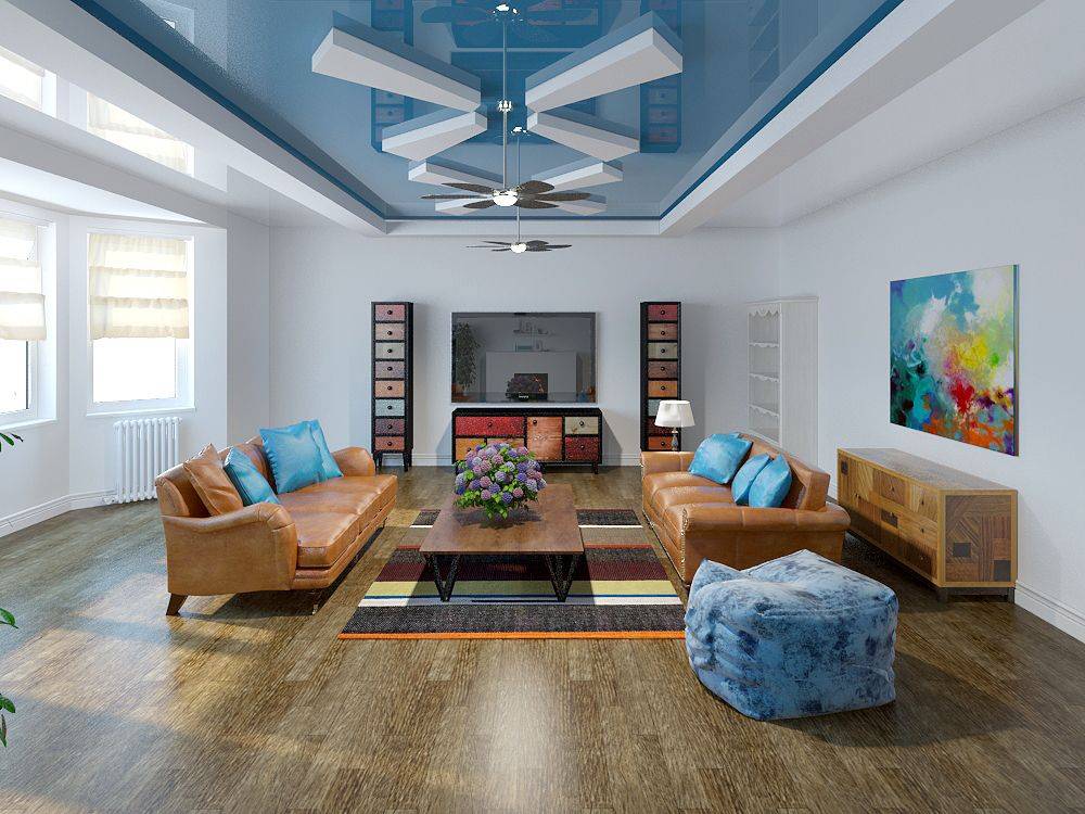 Современный стиль используется для оформления квартиры чаще других. Простые линии сочетаются с неожиданными цветами. Потолок синего цвета может контрастировать с мебелью и другими поверхностями или выступает в единой цветовой палитре.