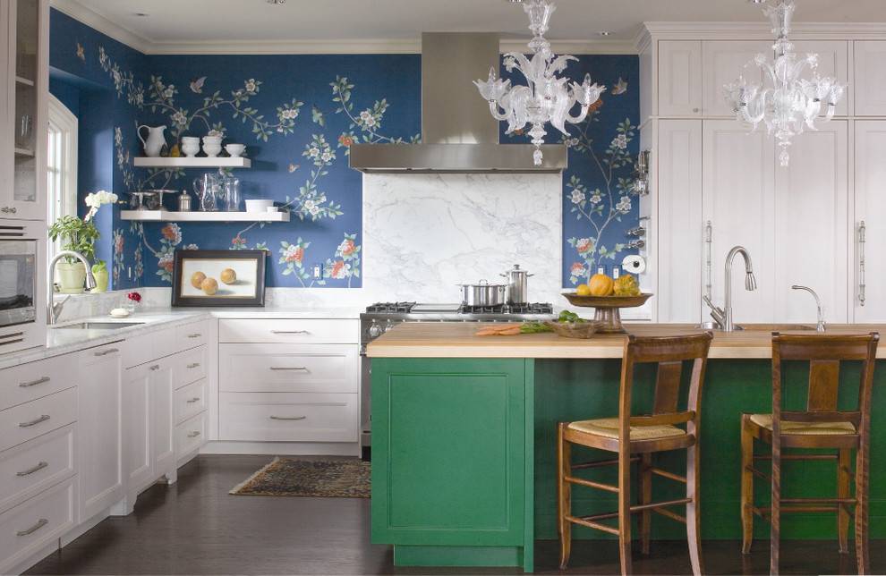 На фото кухня со стенами облицованными обоями с цветочным узором.