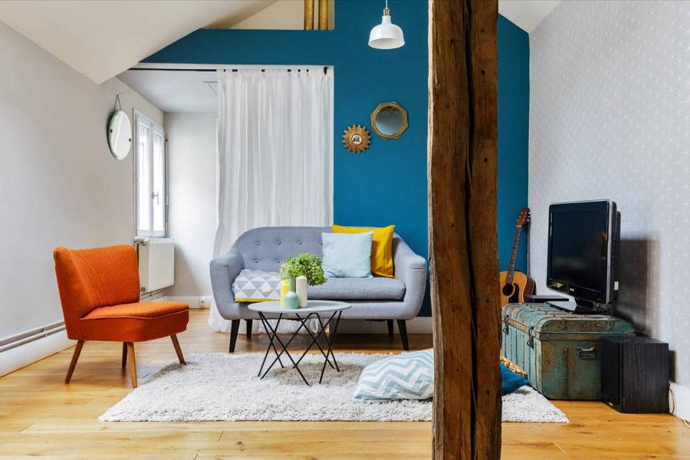 На фото торцевая стена небольшого зала оформлена фотообоями, на которых очень привлекательно смотрятся изображения ярких фасадов домов. Такой дизайнерский прием не оставит равнодушным ни одного гостя.