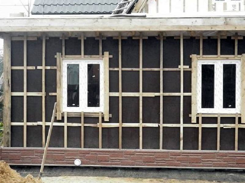 Под обрешеткой рекомендуется располагать ветропароизоляционную пленку, особенно важно это сделать, если планируется укладка теплоизоляционного слоя. Количество пленки зависит от площади стены