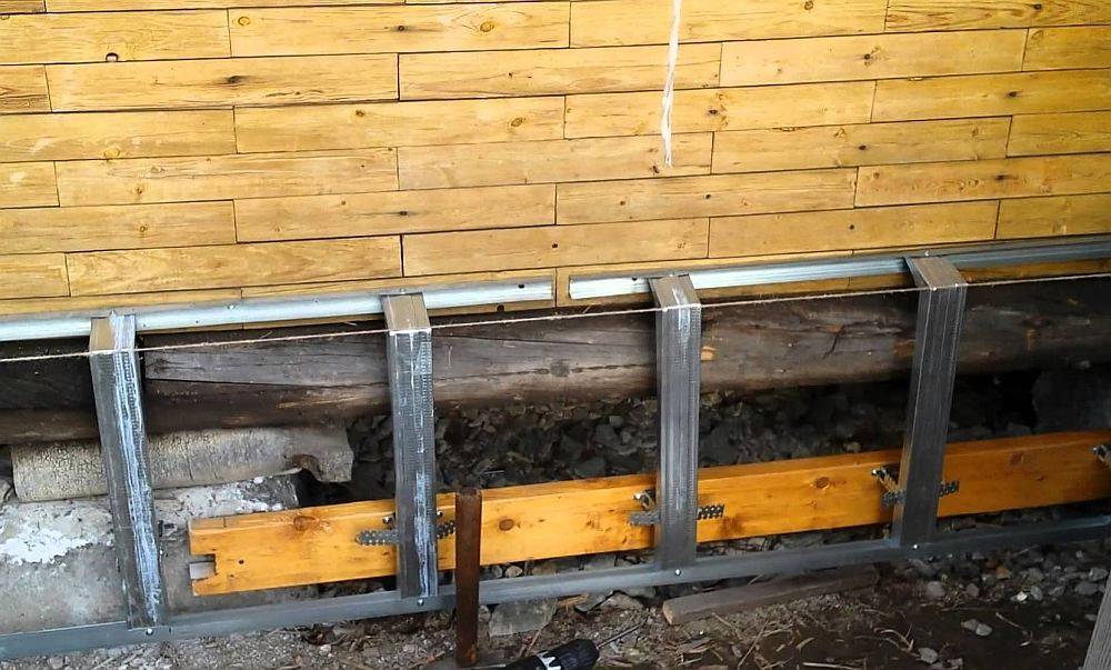 Для обшивки цоколя лучше использовать не деревянную обрешетку, а прочный каркас из оцинкованных профилей. Он выдержит вес как полипропиленовых, так и металлических панелей с утеплителем.
