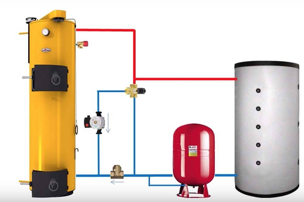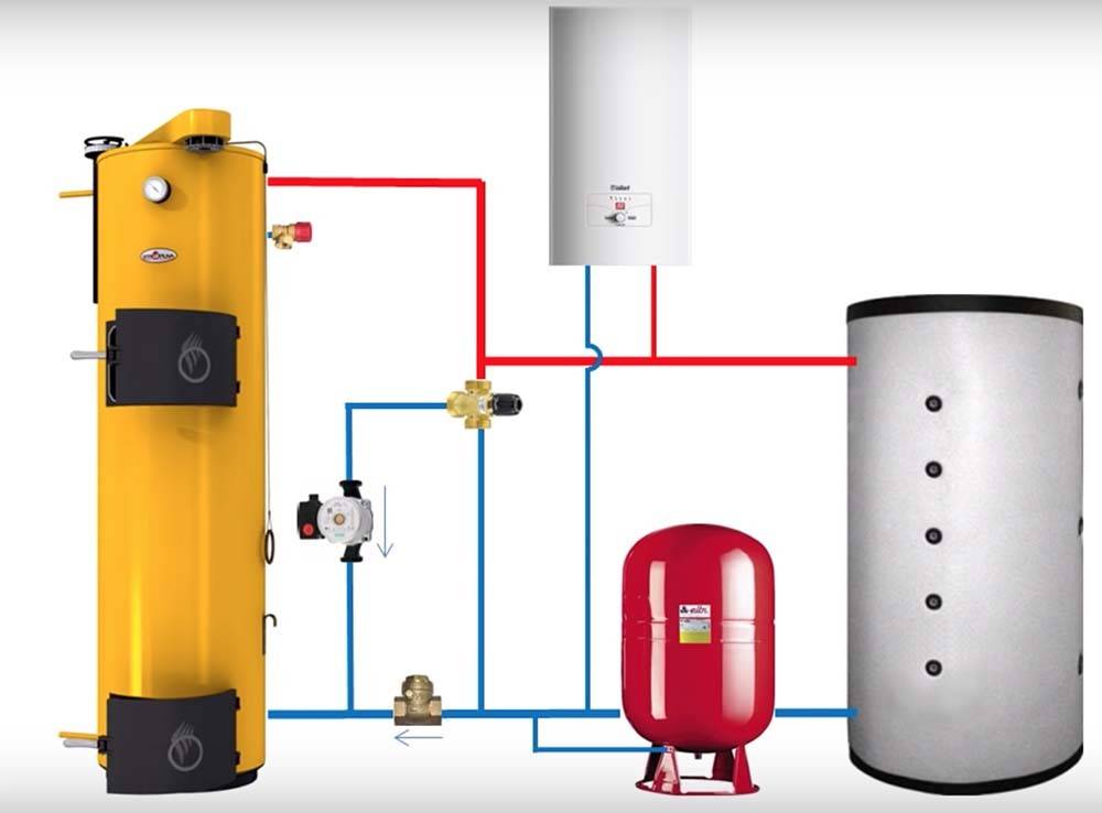 Схема подключения твердотопливного котла к теплоаккумулятору двойного назначения: