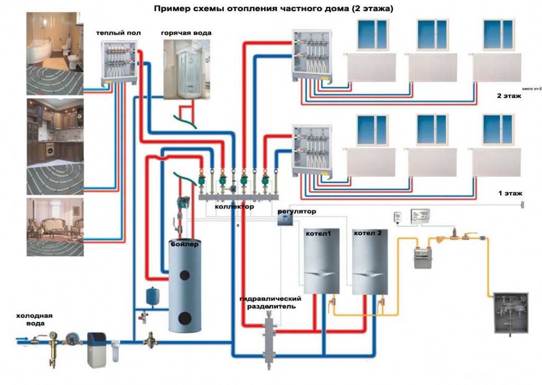 Для двух и более этажных домов есть некоторые обязательные моменты, которые менее важны при использовании отопления в небольшом дачном домике. Прежде всего, это мощность отопительного котла. Поскольку в двухэтажном доме протяженность трубопровода и количество радиаторов больше, чем в одноэтажном, то и котел должен быть повышенной мощности. Обычно производители котов указывают, на какую площадь рассчитано данное оборудование. Поэтому при покупке котла учтите площади всех помещений (в том числе и вспомогательных), которые будут им отапливаться. Насос для организации принудительной циркуляции – следующий важный элемент. Чем быстрее движется нагретая вода по трубам, тем быстрее происходит нагрев помещений. С помощью насоса этот процесс значительно ускоряется.