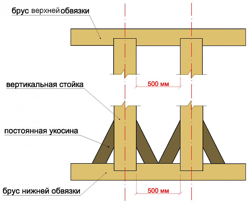 Крепить обвязку можно при помощи металлических уголков или врубок. Прибегнув ко второму способу, необходимо заранее высчитать длину стойки с учетом дальнейшей врубки.