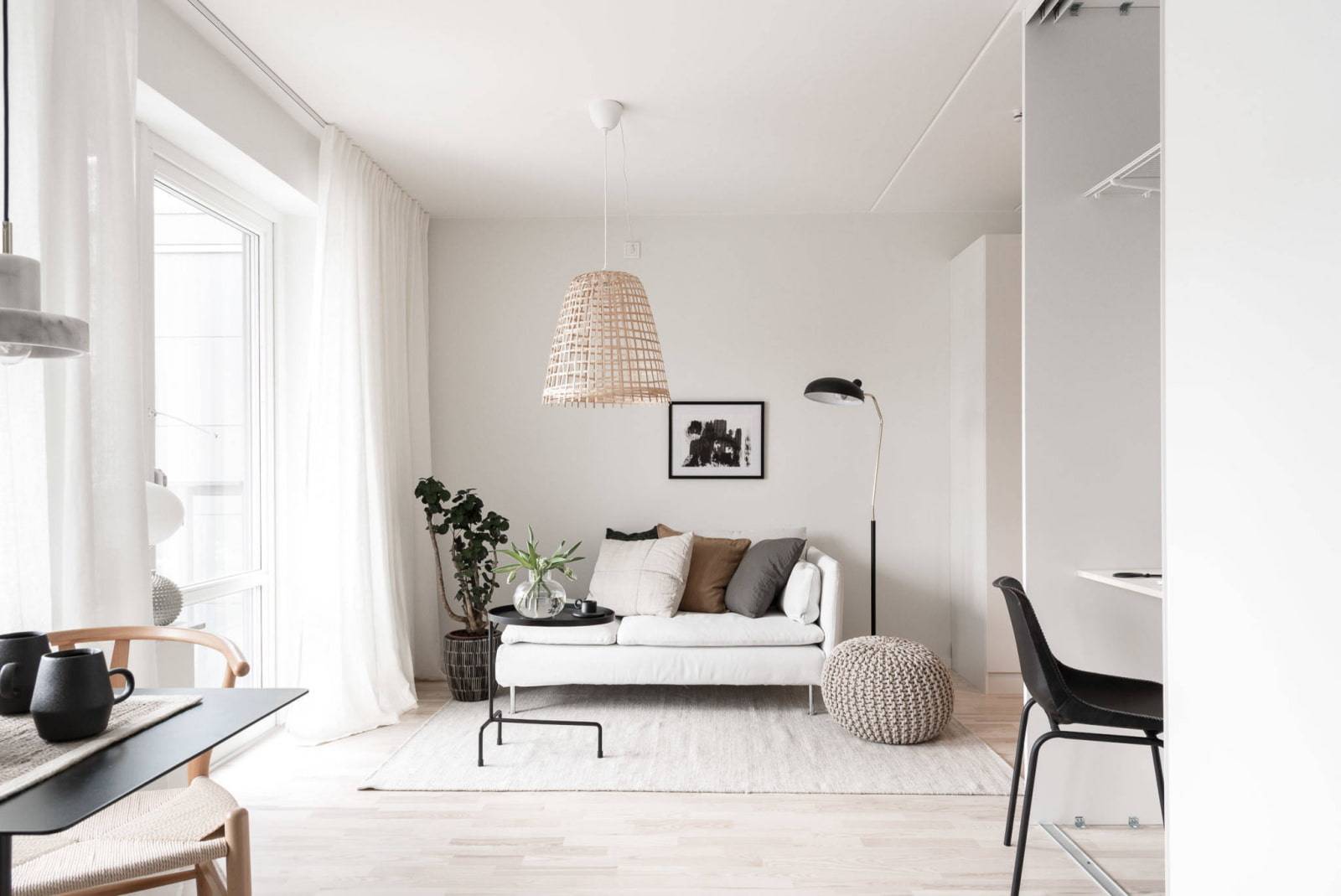 Оптимальное решение для интерьера квартиры 38 кв. метров – скандинавский стиль: нейтральные по цвету стены и потолок, деревянный декор и минимум мебели.