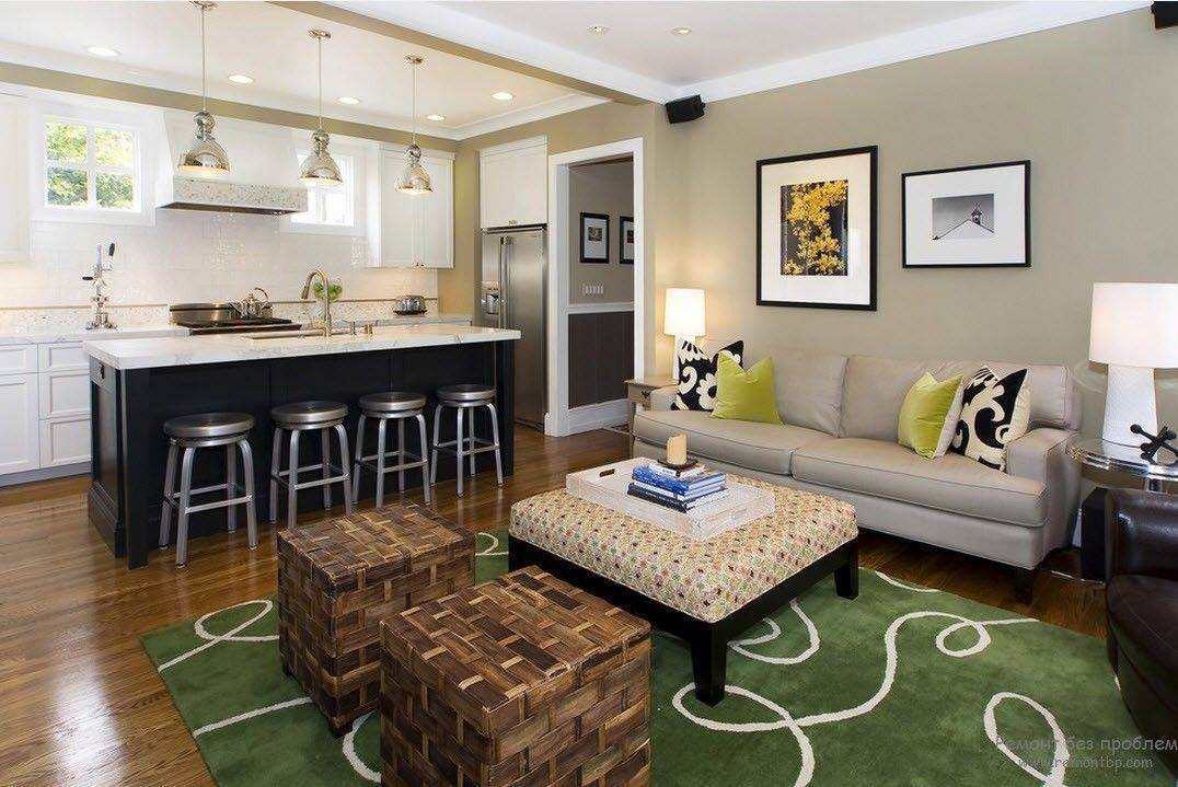 Дальше нужно выполнить зонирование в 1-комнатной квартире в стиле лофт. Зонирование предполагает разделение кухонной и жилой зоны посредством доступных средств, коими могут выступать: