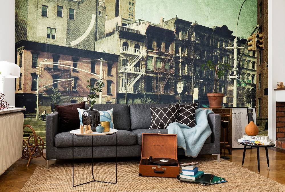 Принт города в помещении создаёт живую атмосферу. Выгодно акцентировать одну, две поверхности, чтобы не возникло диссонанса. Такой рисунок подойдёт для комнаты подростка, в качестве фартука кухни, декорации в гостиной.