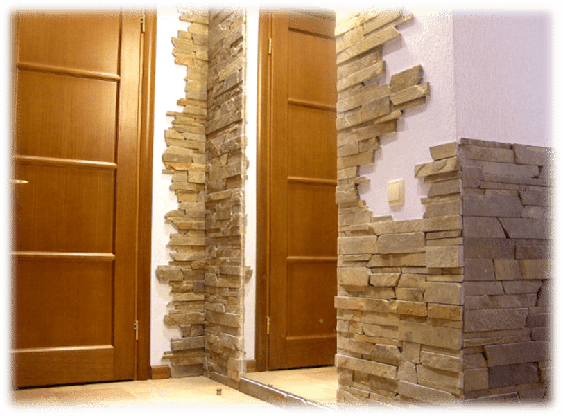 Если дверные откосы не имеют дверного полотна, то укладка декоративного камня происходит внахлест. При наличии двери цвет и фактура проемов должны гармонично вписываться в интерьер и сочетаться с другими декоративными отделочными материалами.