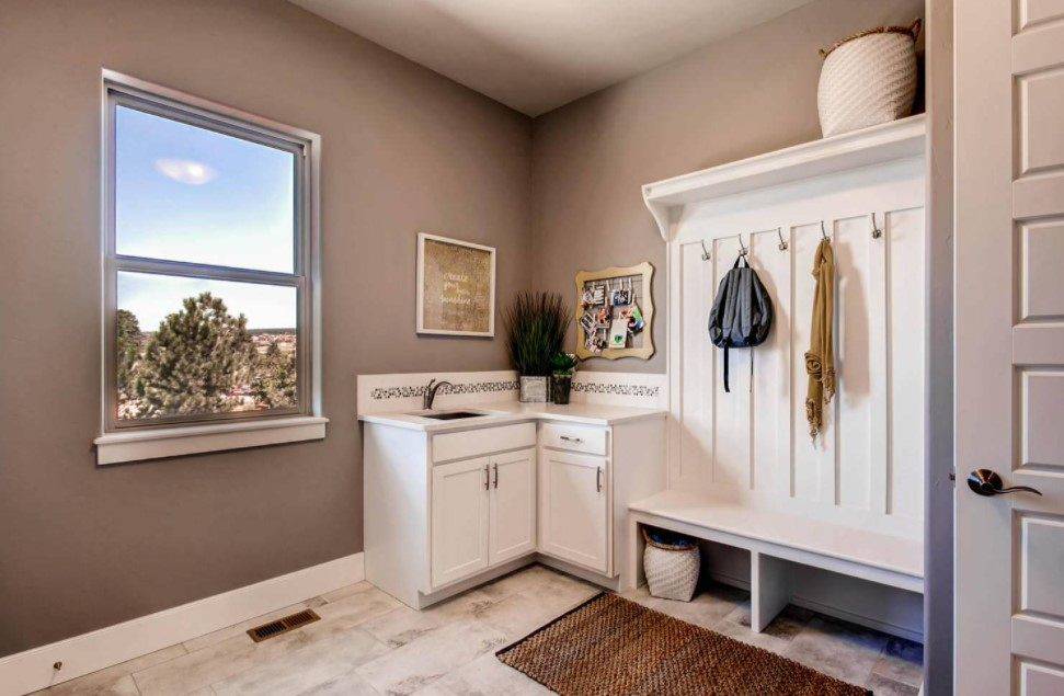 Первая комната, встречающая гостей и уставших владельцев, должна отличаться удобством размещения мебели и практичностью отделки. Здесь необходимо предусмотреть место для размещения верхней одежды и обуви, пуфик и диванчик для переобувания, полочку для ключей, сумок или зонтов.