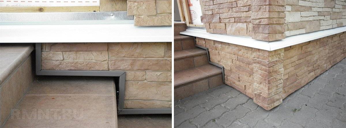 Перед закреплением крайних панелей необходимо предварительно зафиксировать так называемые старты угловых накладок. Углы и верхняя замыкающая полоса крепятся в последнюю очередь, когда основные плоскости цоколя уже обшиты. Есть, однако, ряд исключений: например, при значительной глубине паза угловых профилей имеет смысл последовательного крепления, чтобы крайние панели впоследствии не приходилось сильно изгибать, чтобы завести кромку на место.