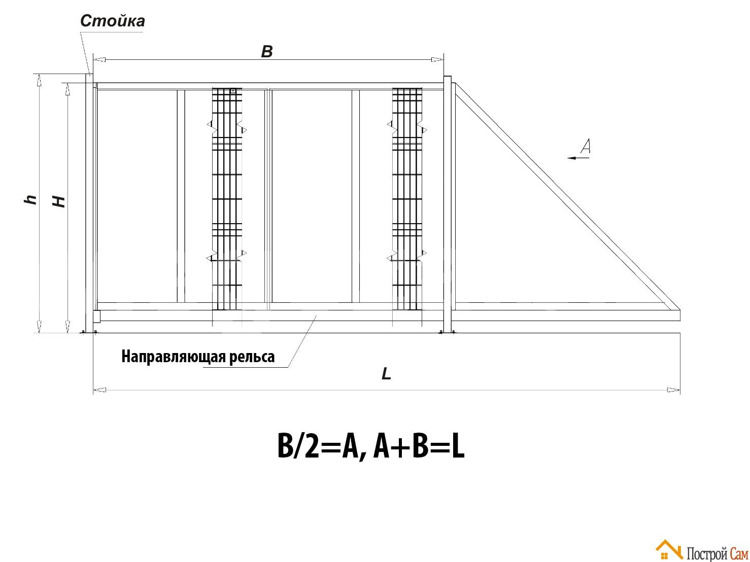 Особое внимание следует уделить габаритам противовесной стороны, которая будет уравновешивать основную, видимую снаружи часть рамы. Соотношения сторон проиллюстрированы на следующей схеме. Пример грамотно спроектированных откатных ворот с точными размерами проёма и калитки на схеме ниже