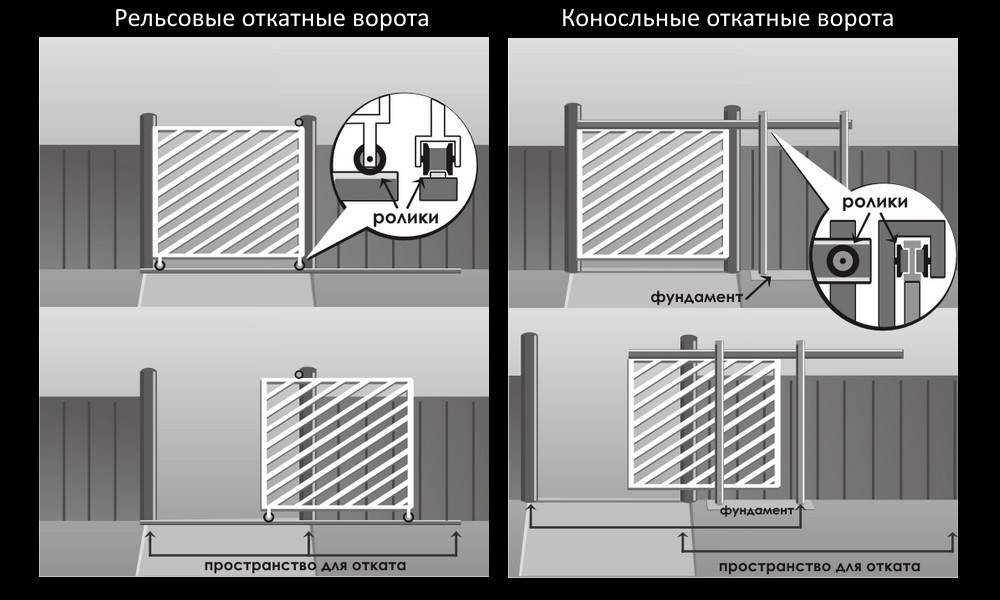 Основа откатных ворот — это правильно расположенная направляющая. Ролики устанавливают при этом за боковой габарит, что позволит при открытии не перекрывать ими проезд.