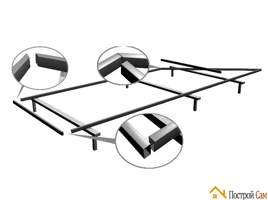 После того как вы определились с размером каркаса можно приступать к его изготовлению, каркас изготавливается из профильной металлической трубы 40x40x 2 мм и 40x20x2 мм для внутренней обрешетки. Для алюминиевых каркасов используют профиль от 60 мм.