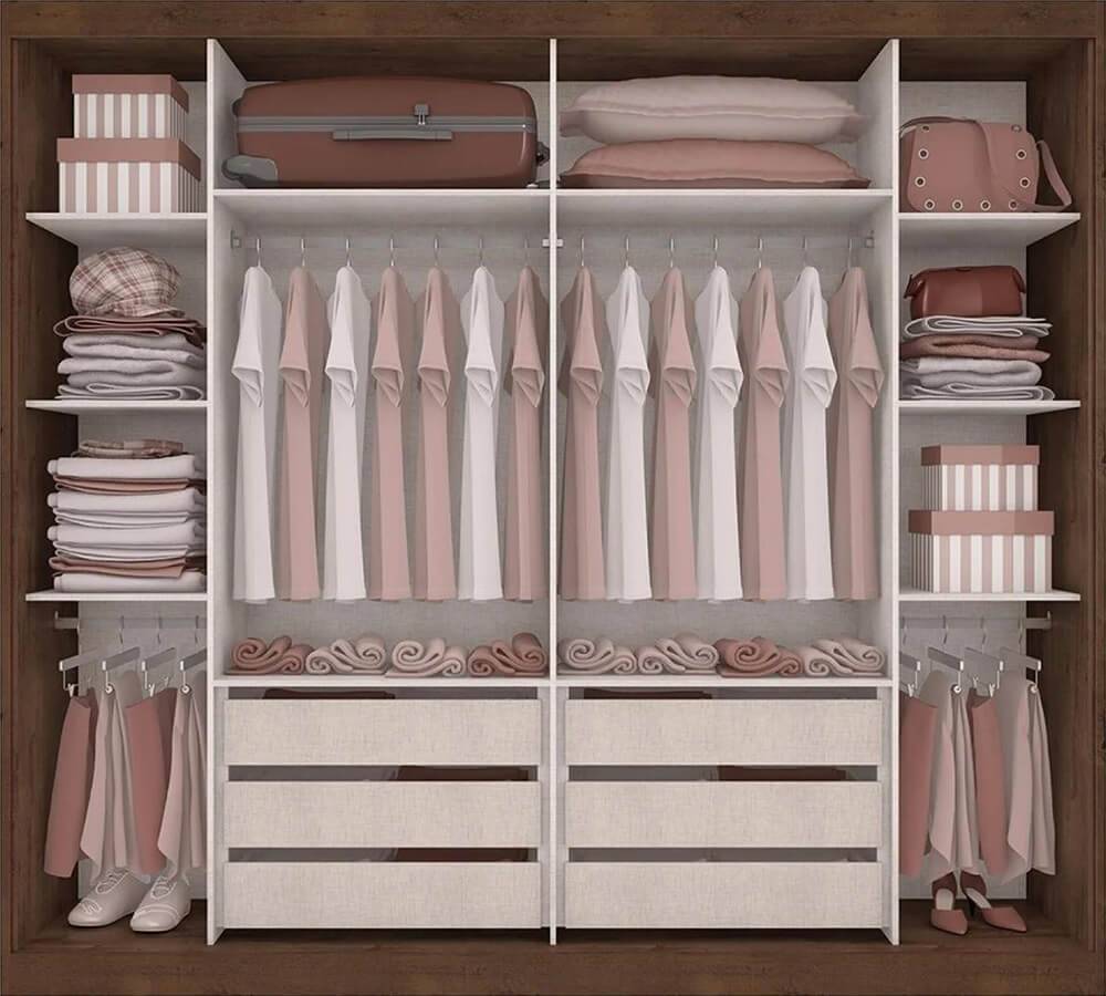 Исходя из этого пространство зонируется так: одно большое отделение с перекладиной, 2 ряда полок или ряд полок посередине и 2 большие секции по бокам. Можно использовать одно отделение со штангой для хранения одежды во весь рост, другое – для пиджаков, рубашек. Это дает возможность применения части пространства для других нужд.