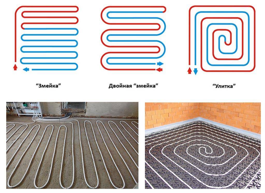 Змейка. Такая схема отопления предпочтительна для небольших помещений. Форма считается не эффективной для прогрева больших пространств. Максимально возможная температура воды находится в начале системы, поэтому укладку начинают от наиболее холодных участков помещения.