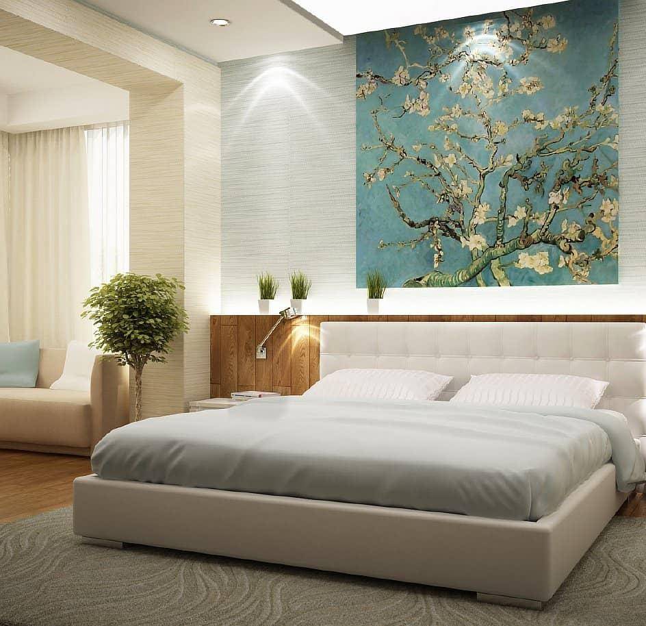 Основная палитра картин должна пересекаться с гаммой отделки спальни.