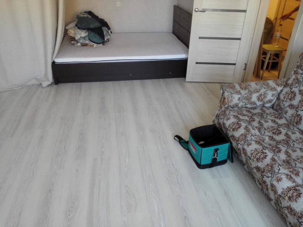 Фото 4. Напольное покрытие в спальне выглядит неотличимо от натурального деревянного.