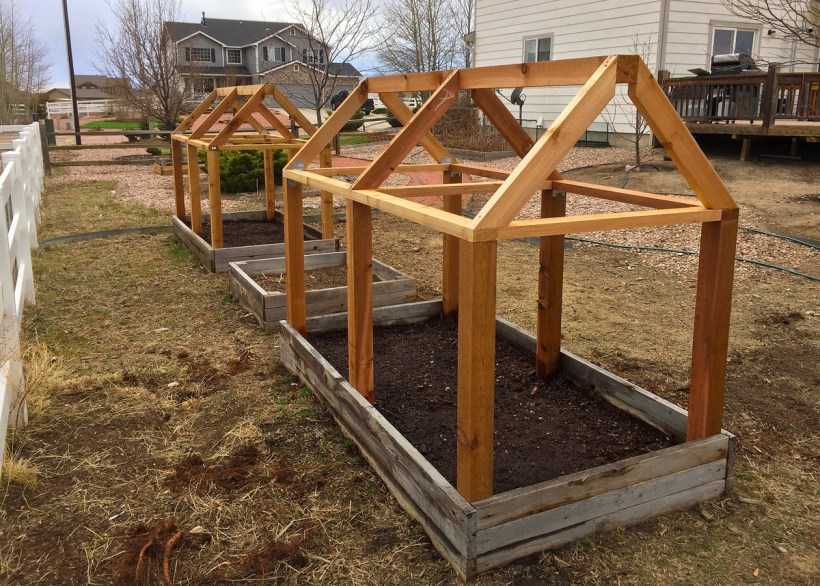 По осевой линии запланированной грядки с шагом 50-80 см устанавливают стойки, заглубляя их на половину высоты так, чтобы верхушки оказались на одном уровне. Стойки должны располагаться вдоль прямой, желательно совпадающей с направлением восток — запад. Далее к верхушкам стоек крепят осевую прожилину, используя мелкие гвозди и хомуты из узкой полоски жести.